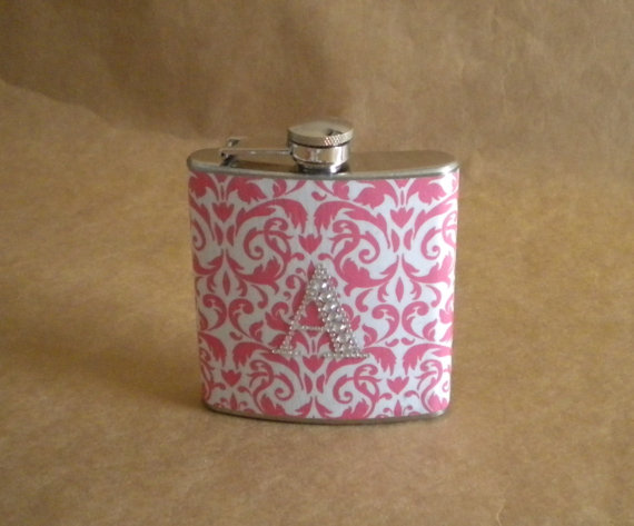 2. Personalised pink damask drink flasks with diamante initial on them